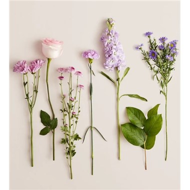 EXCLUSIVE Just like a daydream. Our delightful lavender bouquet is gathered with accents of pink and lush greenery in a glass vase tied with a lavender satin ribbon that complements the delicate beauty of the blooms.